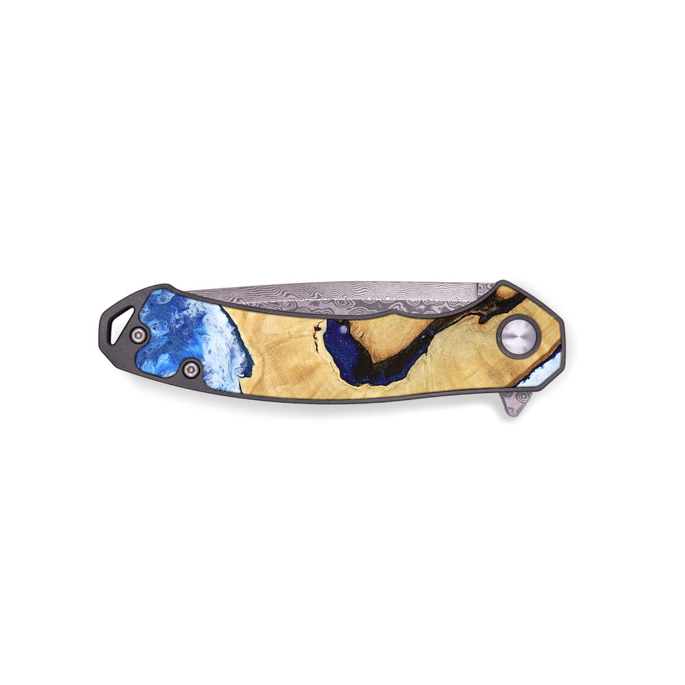 Experience the perfect blend of form and function with our durable folding pocket knife, featuring a lightweight titanium handle. The Damascus stainless steel blade is complemented by a unique wood burl and resin inlay. Imported blade and handle.