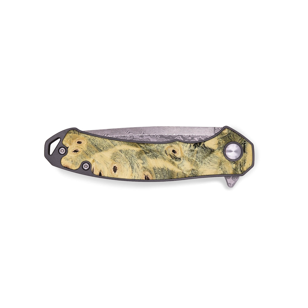 Experience the perfect blend of form and function with our durable folding pocket knife, featuring a lightweight titanium handle. The Damascus stainless steel blade is complemented by a unique wood burl and resin inlay. Imported blade and handle.