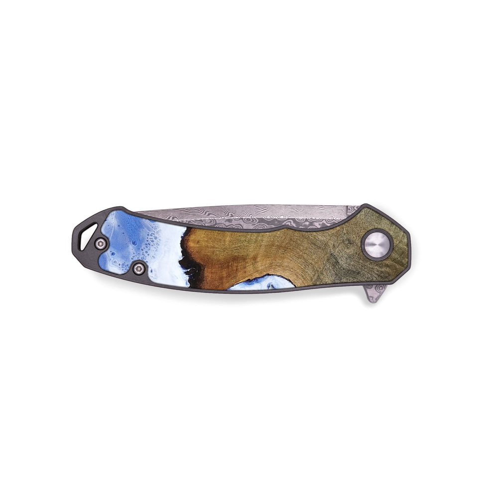 Experience the perfect blend of form and function with our durable folding pocket knife, featuring a lightweight titanium handle. The Damascus stainless steel blade is complemented by a unique wood burl and resin inlay. Imported blade and handle.