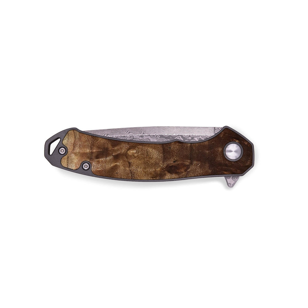 Experience the perfect blend of form and function with our durable folding pocket knife, featuring a lightweight titanium handle. The Damascus stainless steel blade is complemented by a unique wood burl and resin inlay. Imported blade and handle.