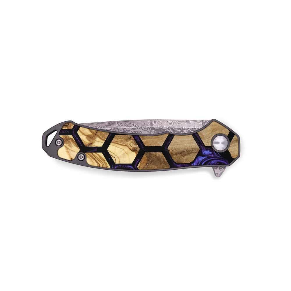 Experience the perfect blend of form and function with our durable folding pocket knife, featuring a lightweight titanium handle. The Damascus stainless steel blade is complemented by a unique wood burl and resin inlay. Imported blade and handle.