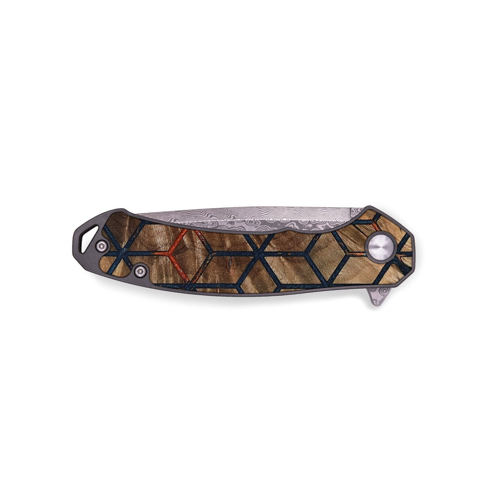 Experience the perfect blend of form and function with our durable folding pocket knife, featuring a lightweight titanium handle. The Damascus stainless steel blade is complemented by a unique wood burl and resin inlay. Imported blade and handle.
