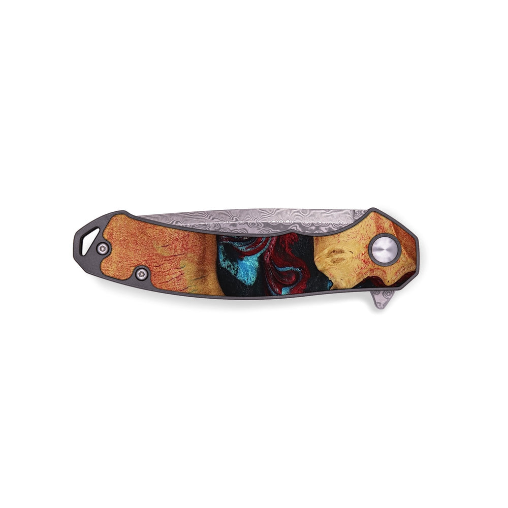 Experience the perfect blend of form and function with our durable folding pocket knife, featuring a lightweight titanium handle. The Damascus stainless steel blade is complemented by a unique wood burl and resin inlay. Imported blade and handle.