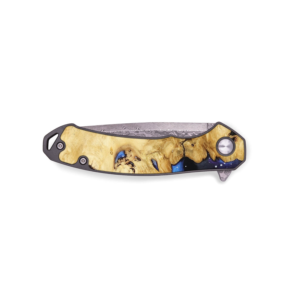 Experience the perfect blend of form and function with our durable folding pocket knife, featuring a lightweight titanium handle. The Damascus stainless steel blade is complemented by a unique wood burl and resin inlay. Imported blade and handle.