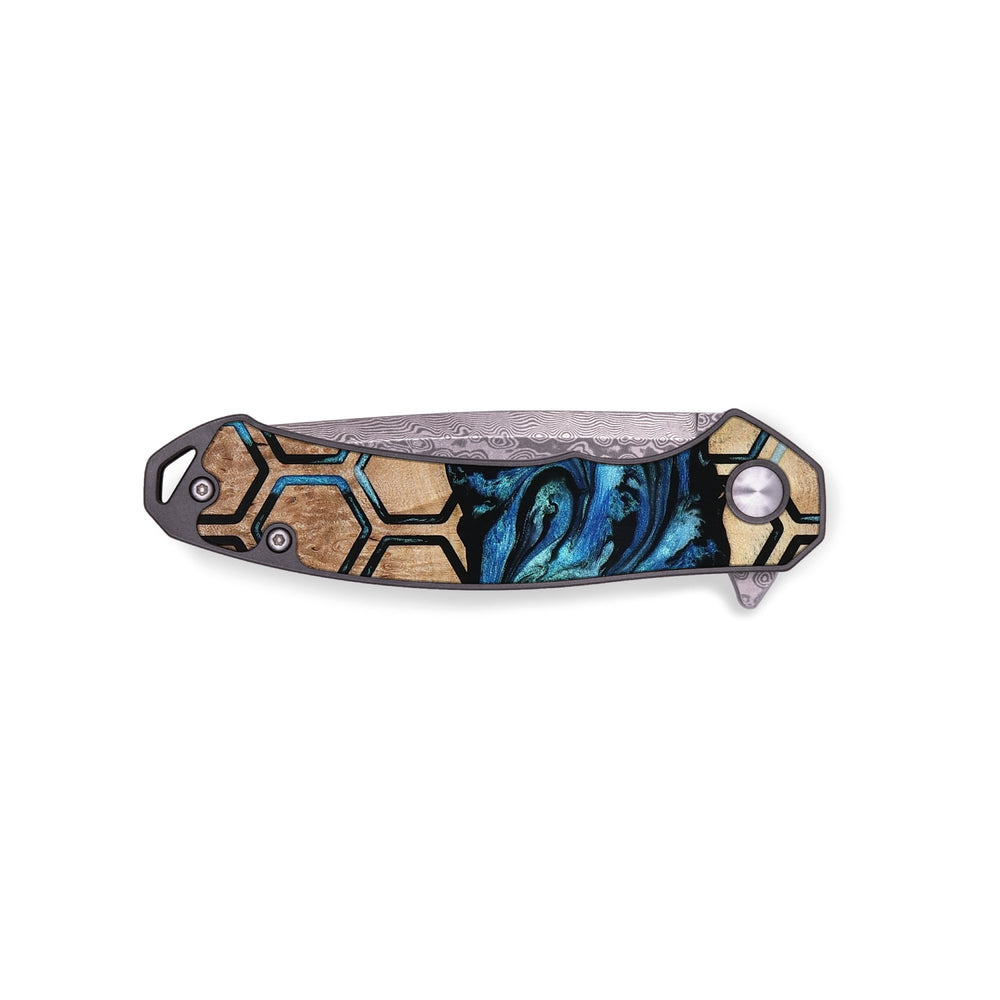 Experience the perfect blend of form and function with our durable folding pocket knife, featuring a lightweight titanium handle. The Damascus stainless steel blade is complemented by a unique wood burl and resin inlay. Imported blade and handle.