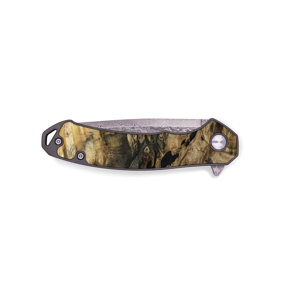 Experience the perfect blend of form and function with our durable folding pocket knife, featuring a lightweight titanium handle. The Damascus stainless steel blade is complemented by a unique wood burl and resin inlay. Imported blade and handle.