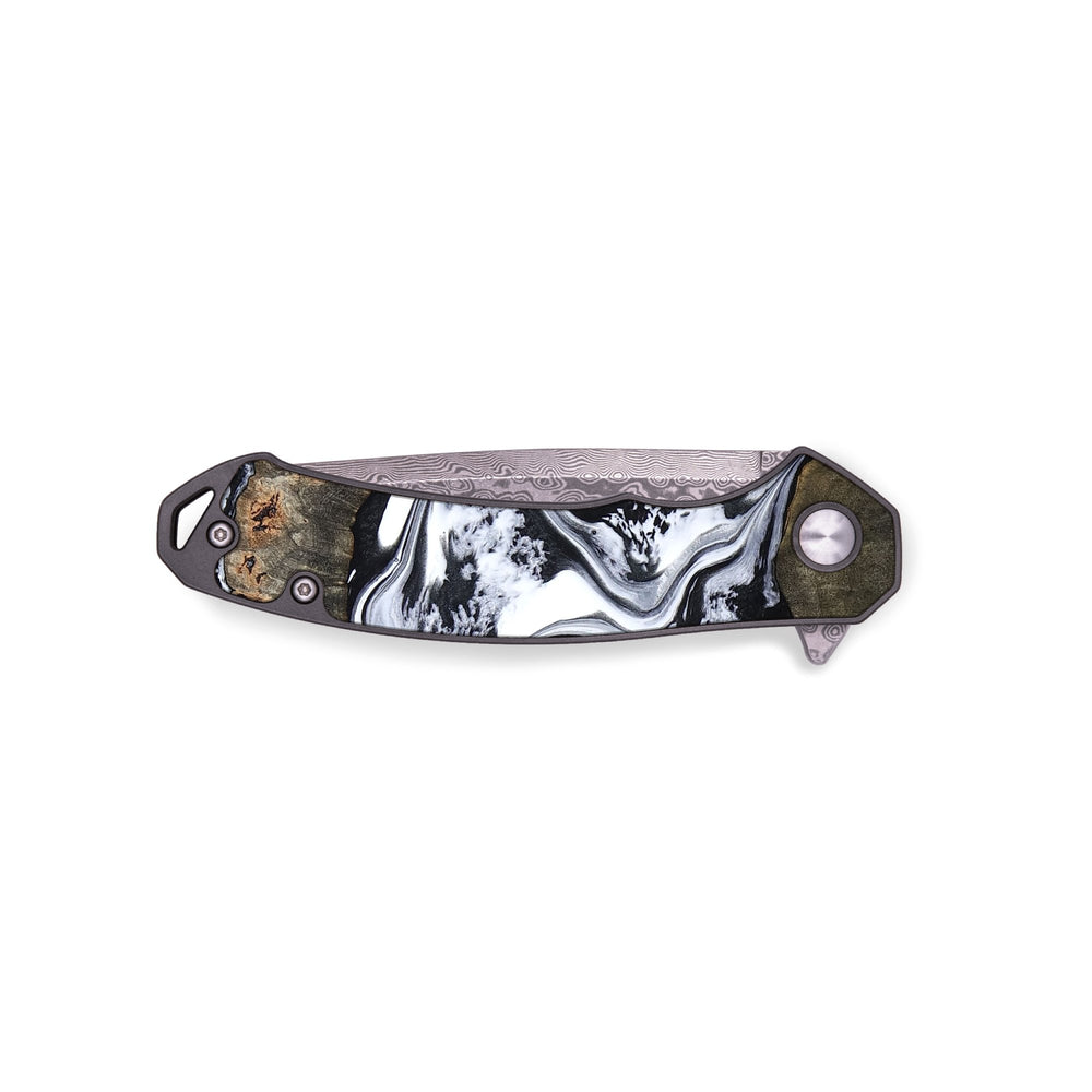 Experience the perfect blend of form and function with our durable folding pocket knife, featuring a lightweight titanium handle. The Damascus stainless steel blade is complemented by a unique wood burl and resin inlay. Imported blade and handle.