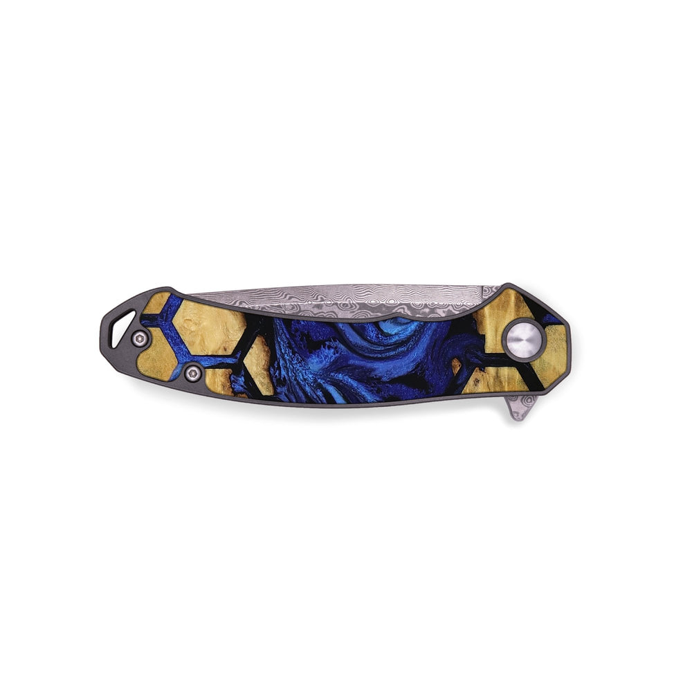 Experience the perfect blend of form and function with our durable folding pocket knife, featuring a lightweight titanium handle. The Damascus stainless steel blade is complemented by a unique wood burl and resin inlay. Imported blade and handle.