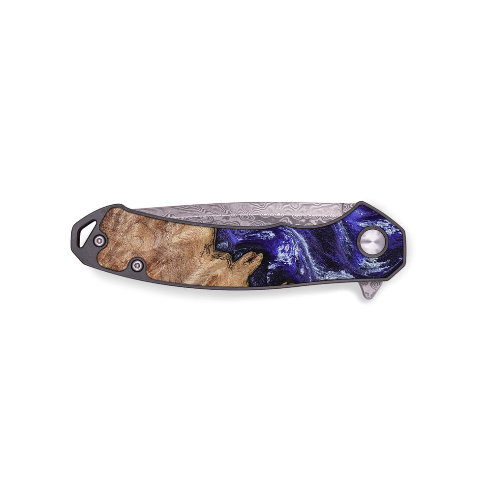 Experience the perfect blend of form and function with our durable folding pocket knife, featuring a lightweight titanium handle. The Damascus stainless steel blade is complemented by a unique wood burl and resin inlay. Imported blade and handle.