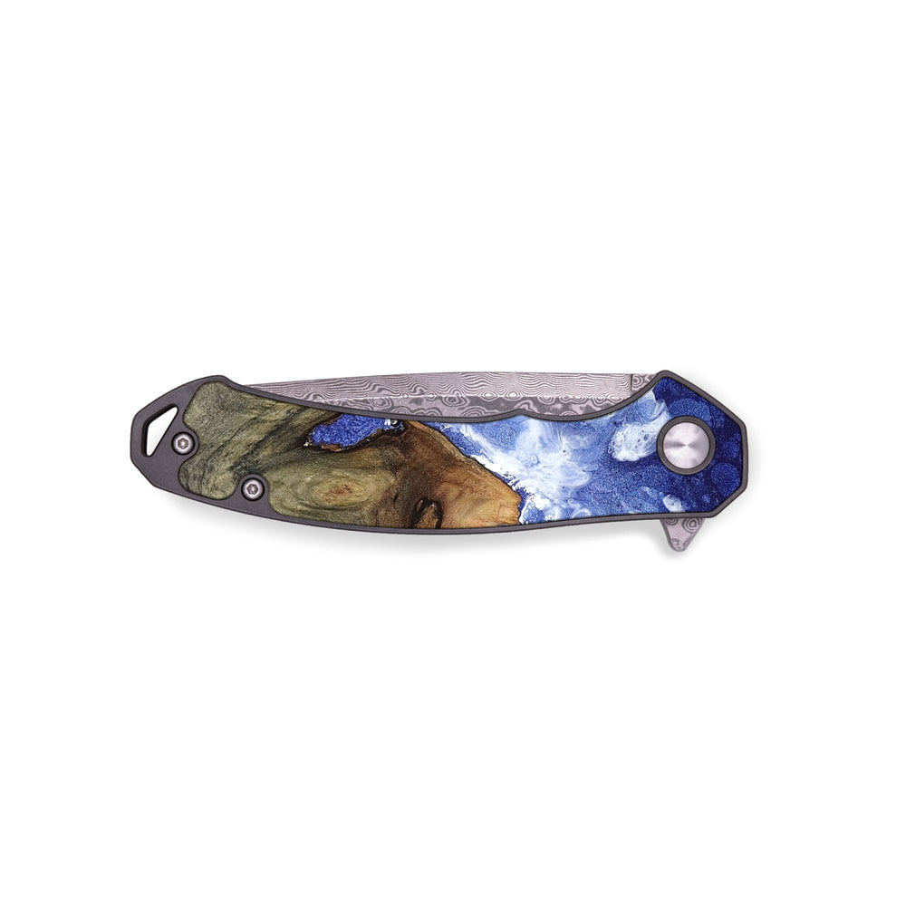 Experience the perfect blend of form and function with our durable folding pocket knife, featuring a lightweight titanium handle. The Damascus stainless steel blade is complemented by a unique wood burl and resin inlay. Imported blade and handle.