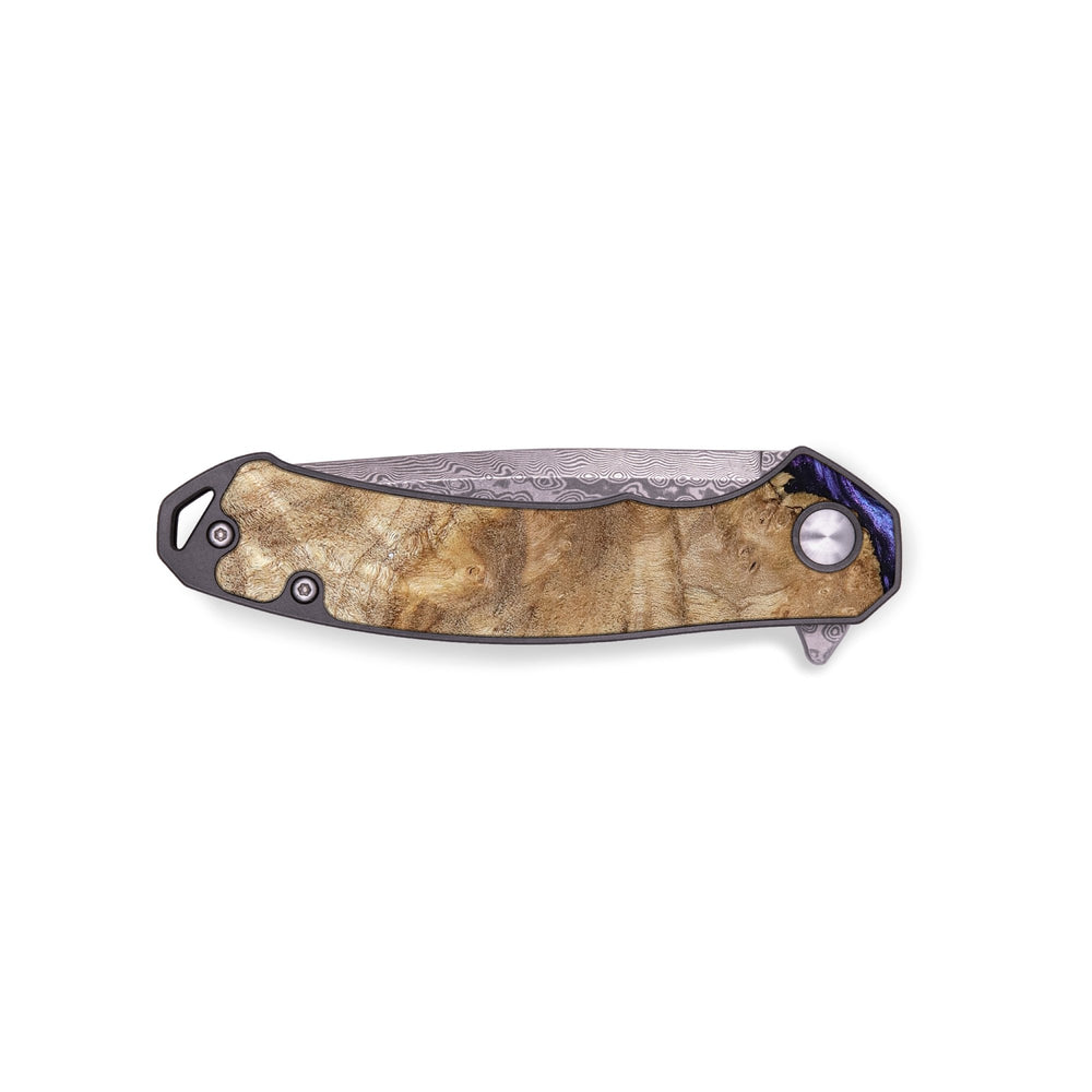 Experience the perfect blend of form and function with our durable folding pocket knife, featuring a lightweight titanium handle. The Damascus stainless steel blade is complemented by a unique wood burl and resin inlay. Imported blade and handle.