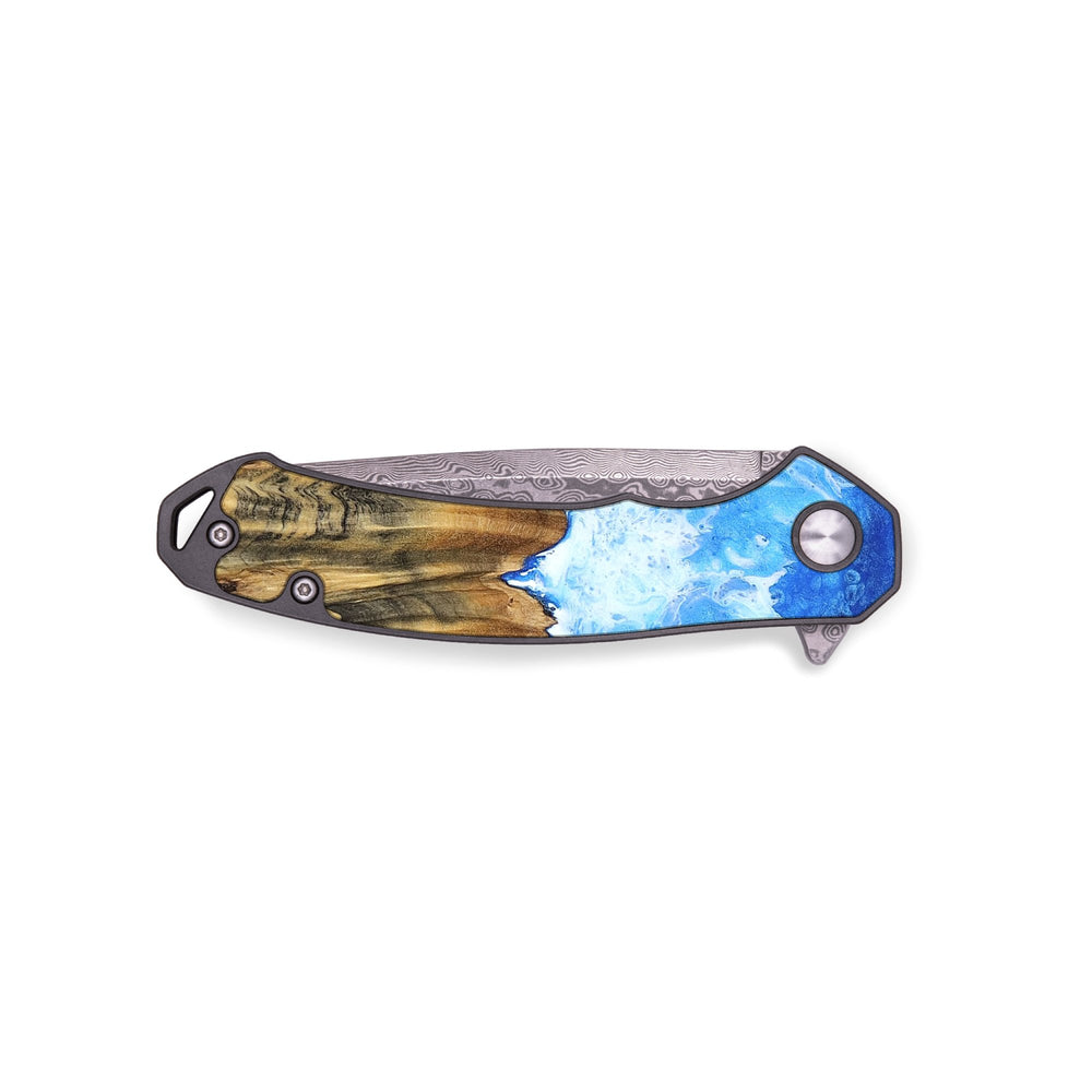 Experience the perfect blend of form and function with our durable folding pocket knife, featuring a lightweight titanium handle. The Damascus stainless steel blade is complemented by a unique wood burl and resin inlay. Imported blade and handle.