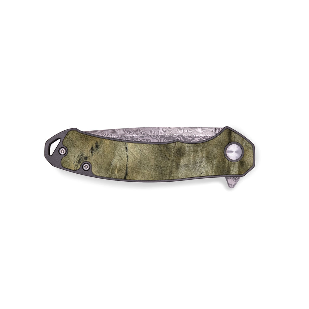 Experience the perfect blend of form and function with our durable folding pocket knife, featuring a lightweight titanium handle. The Damascus stainless steel blade is complemented by a unique wood burl and resin inlay. Imported blade and handle.