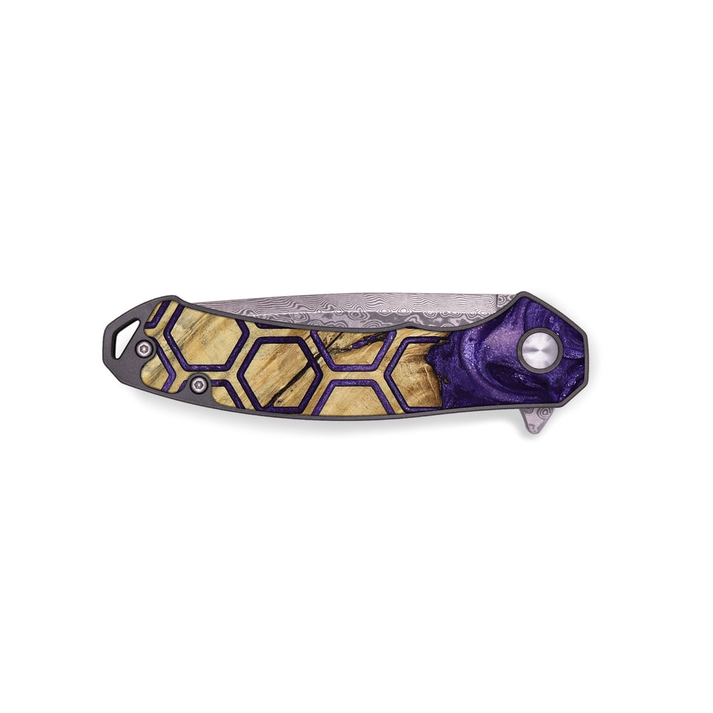 Experience the perfect blend of form and function with our durable folding pocket knife, featuring a lightweight titanium handle. The Damascus stainless steel blade is complemented by a unique wood burl and resin inlay. Imported blade and handle.