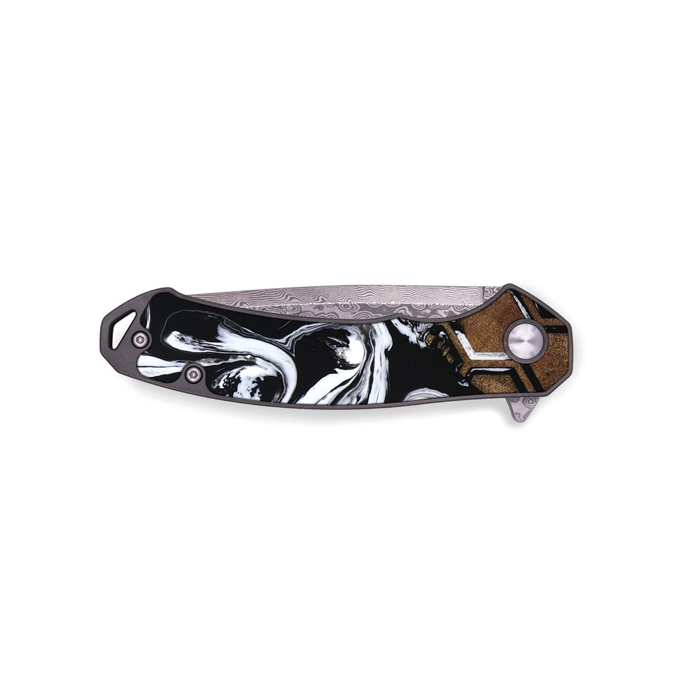 Experience the perfect blend of form and function with our durable folding pocket knife, featuring a lightweight titanium handle. The Damascus stainless steel blade is complemented by a unique wood burl and resin inlay. Imported blade and handle.