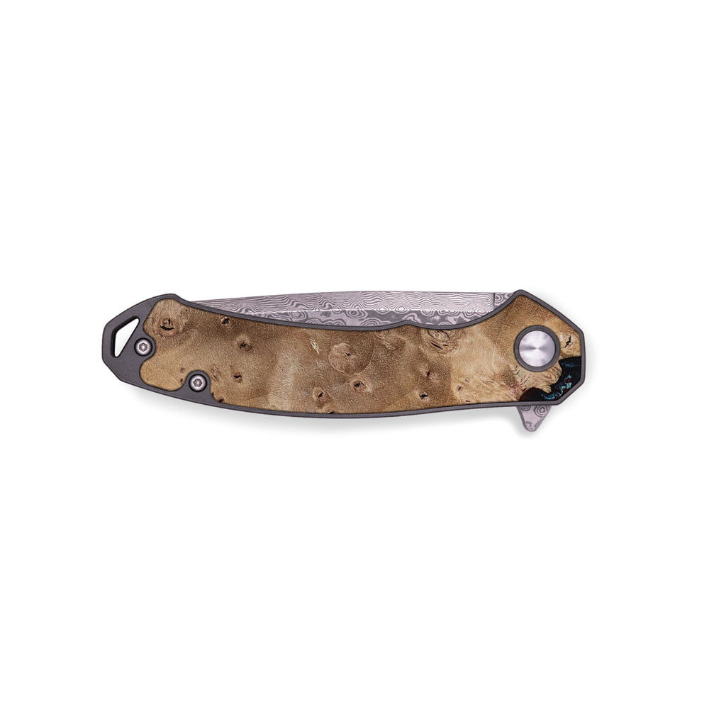 Experience the perfect blend of form and function with our durable folding pocket knife, featuring a lightweight titanium handle. The Damascus stainless steel blade is complemented by a unique wood burl and resin inlay. Imported blade and handle.