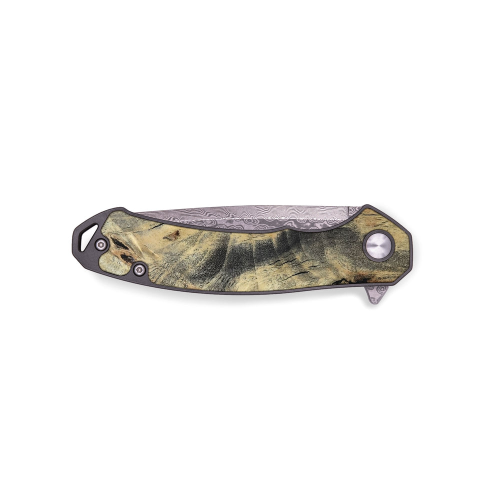 Experience the perfect blend of form and function with our durable folding pocket knife, featuring a lightweight titanium handle. The Damascus stainless steel blade is complemented by a unique wood burl and resin inlay. Imported blade and handle.