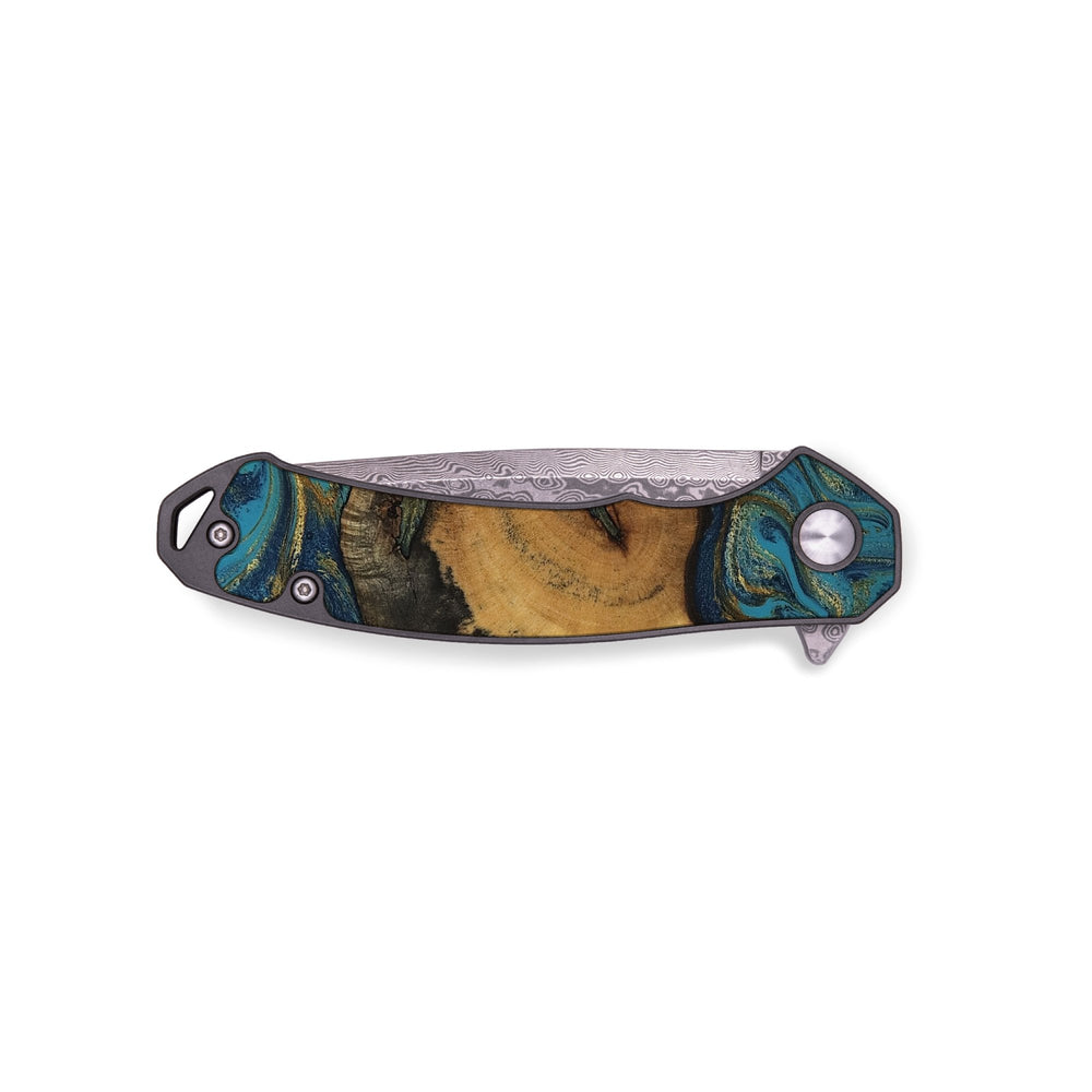 Experience the perfect blend of form and function with our durable folding pocket knife, featuring a lightweight titanium handle. The Damascus stainless steel blade is complemented by a unique wood burl and resin inlay. Imported blade and handle.
