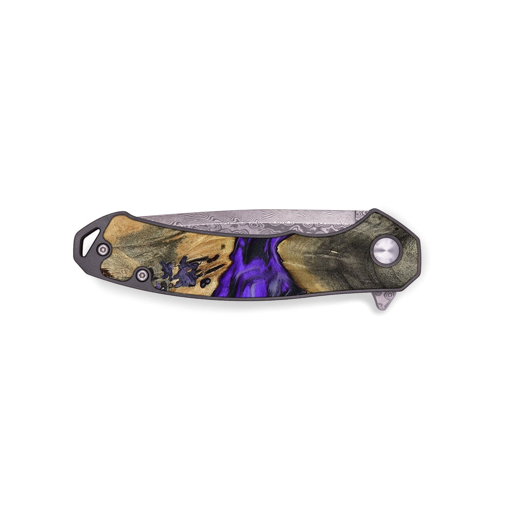 Experience the perfect blend of form and function with our durable folding pocket knife, featuring a lightweight titanium handle. The Damascus stainless steel blade is complemented by a unique wood burl and resin inlay. Imported blade and handle.