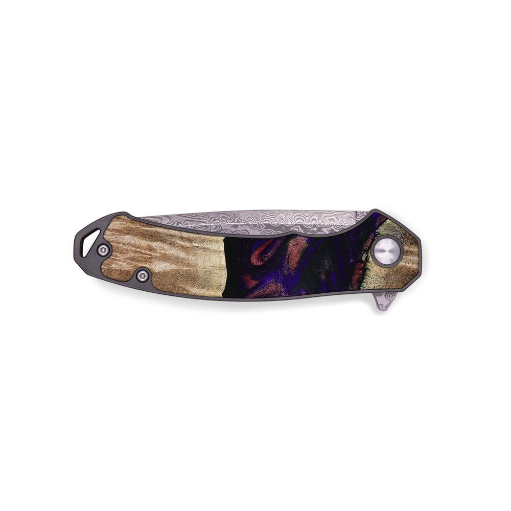 Experience the perfect blend of form and function with our durable folding pocket knife, featuring a lightweight titanium handle. The Damascus stainless steel blade is complemented by a unique wood burl and resin inlay. Imported blade and handle.