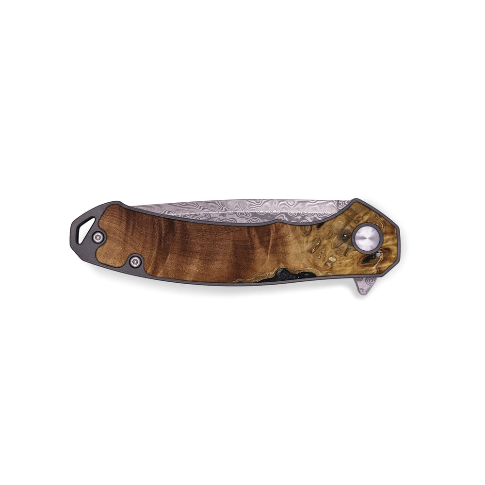 Experience the perfect blend of form and function with our durable folding pocket knife, featuring a lightweight titanium handle. The Damascus stainless steel blade is complemented by a unique wood burl and resin inlay. Imported blade and handle.