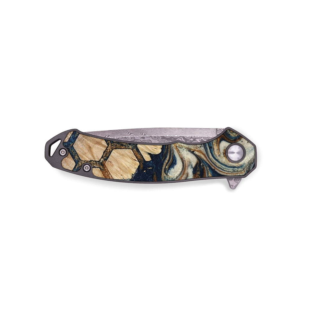 Experience the perfect blend of form and function with our durable folding pocket knife, featuring a lightweight titanium handle. The Damascus stainless steel blade is complemented by a unique wood burl and resin inlay. Imported blade and handle.