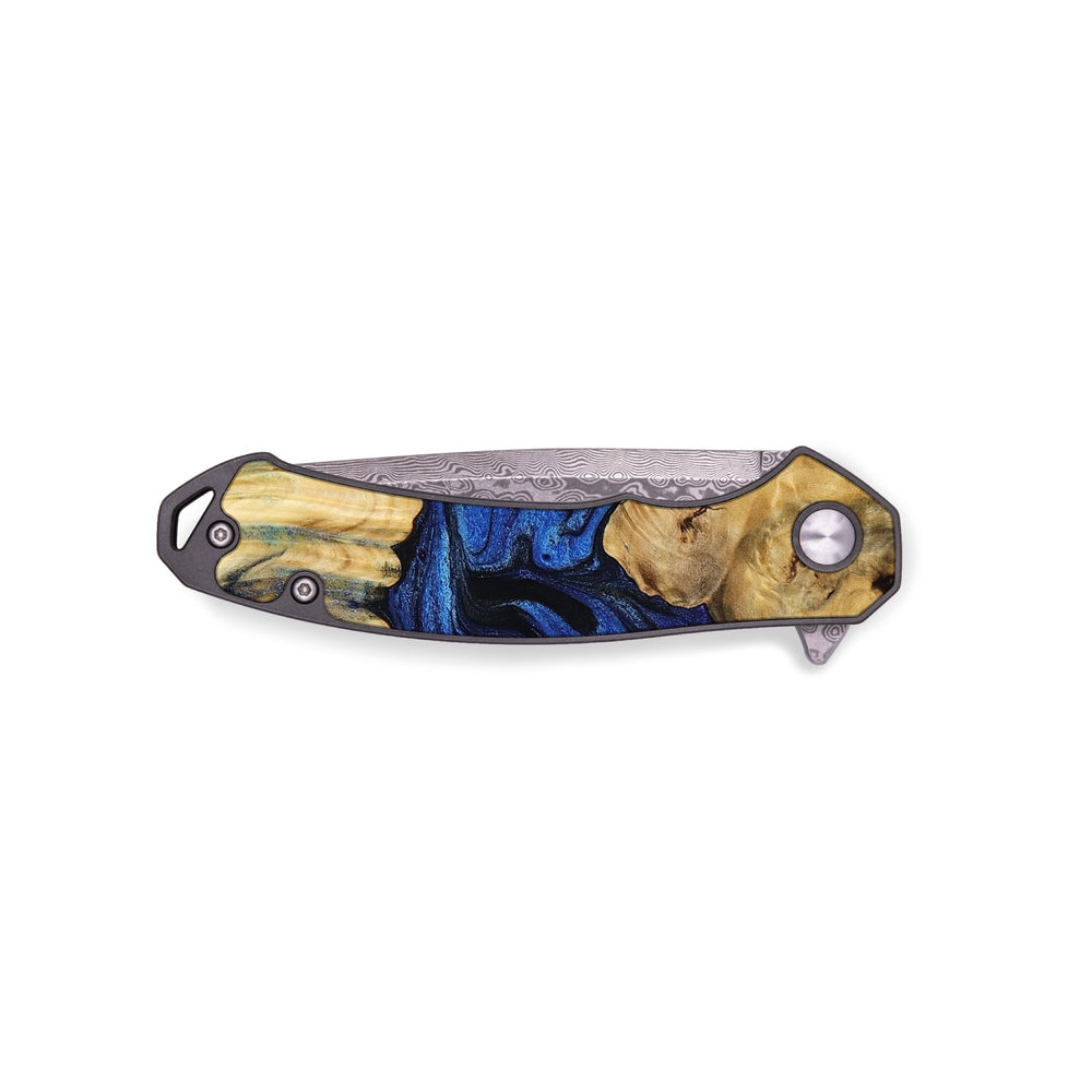 Experience the perfect blend of form and function with our durable folding pocket knife, featuring a lightweight titanium handle. The Damascus stainless steel blade is complemented by a unique wood burl and resin inlay. Imported blade and handle.