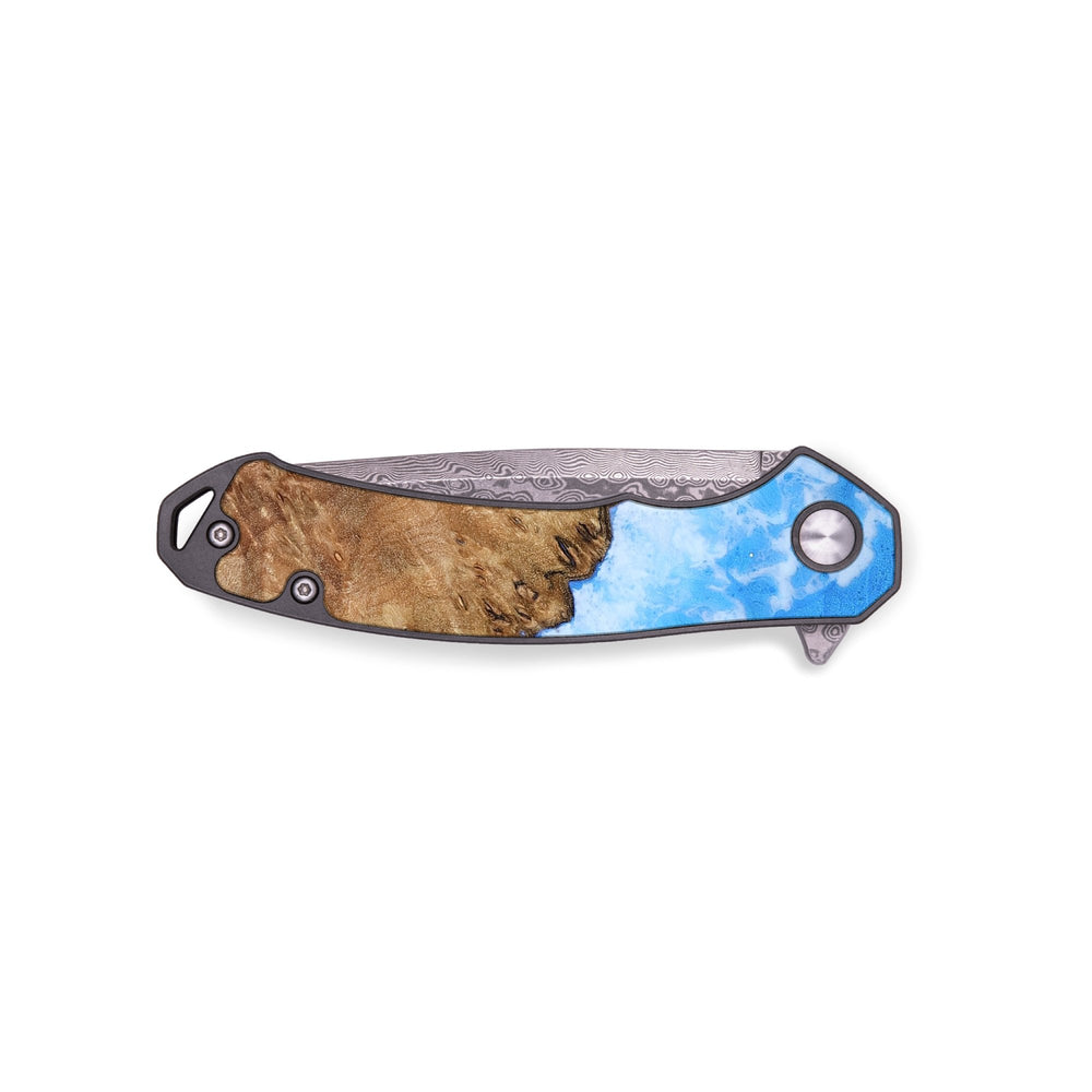 Experience the perfect blend of form and function with our durable folding pocket knife, featuring a lightweight titanium handle. The Damascus stainless steel blade is complemented by a unique wood burl and resin inlay. Imported blade and handle.