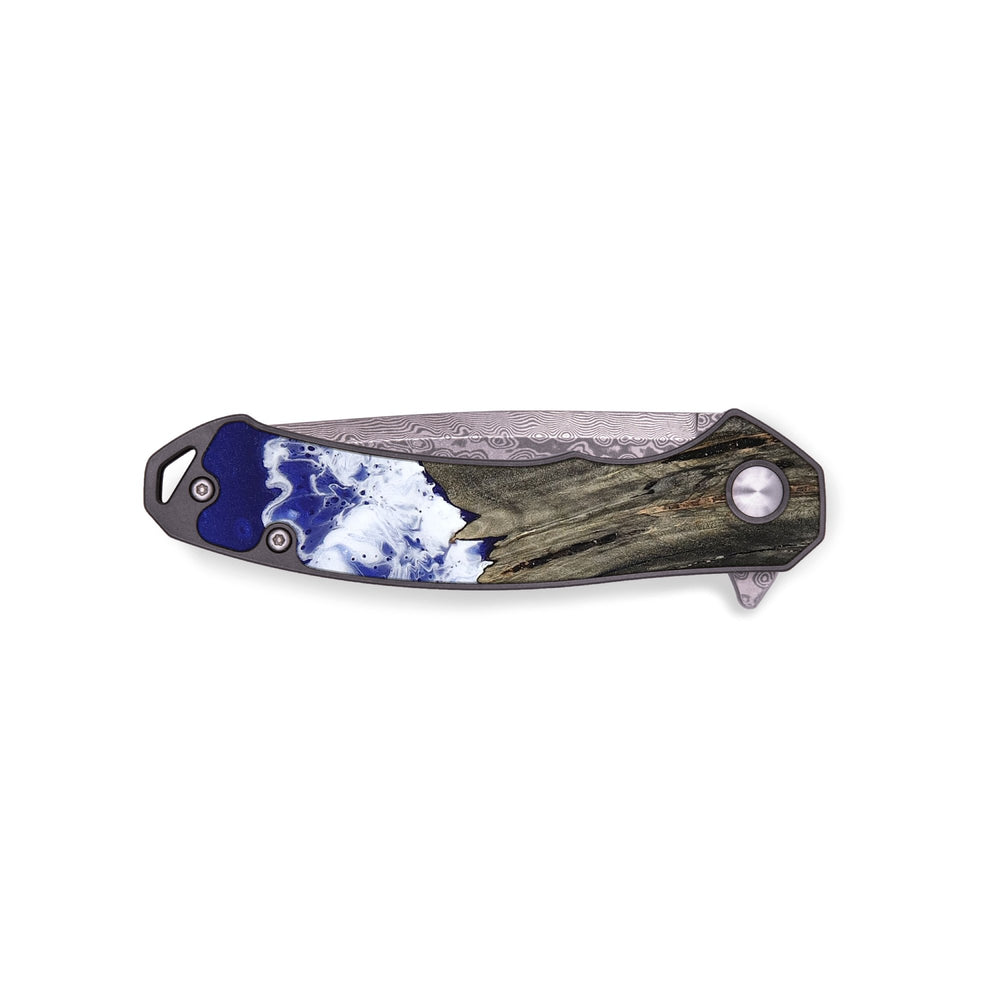Experience the perfect blend of form and function with our durable folding pocket knife, featuring a lightweight titanium handle. The Damascus stainless steel blade is complemented by a unique wood burl and resin inlay. Imported blade and handle.