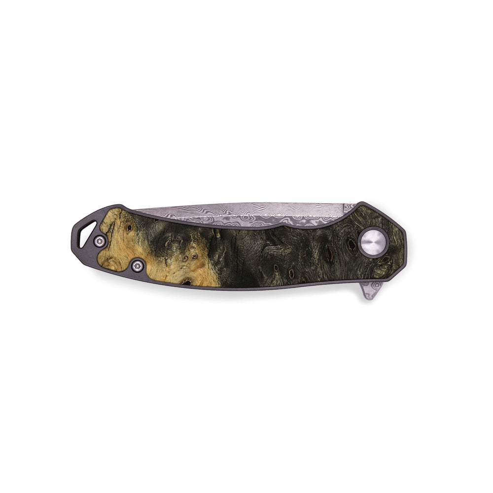 Experience the perfect blend of form and function with our durable folding pocket knife, featuring a lightweight titanium handle. The Damascus stainless steel blade is complemented by a unique wood burl and resin inlay. Imported blade and handle.