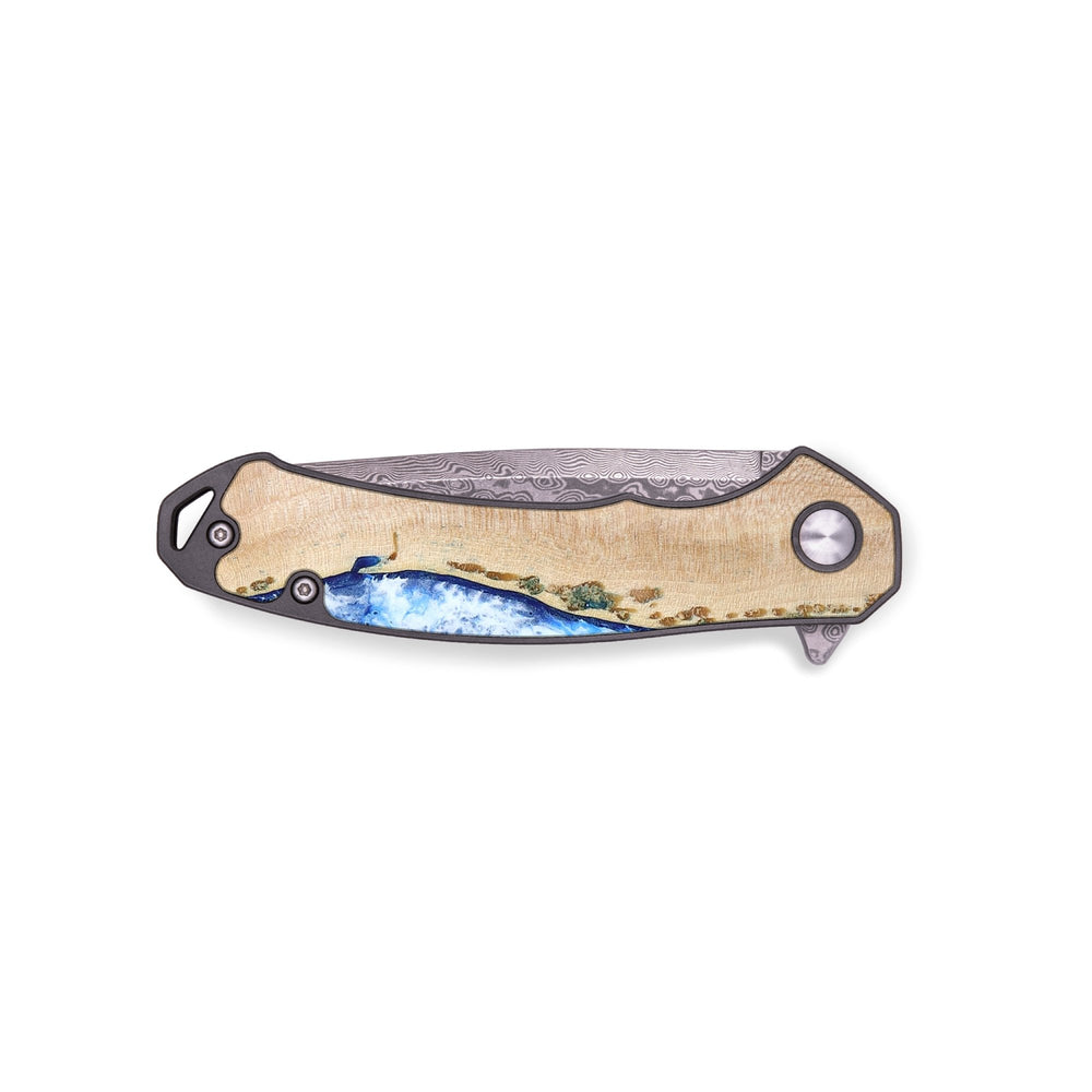 Experience the perfect blend of form and function with our durable folding pocket knife, featuring a lightweight titanium handle. The Damascus stainless steel blade is complemented by a unique wood burl and resin inlay. Imported blade and handle.