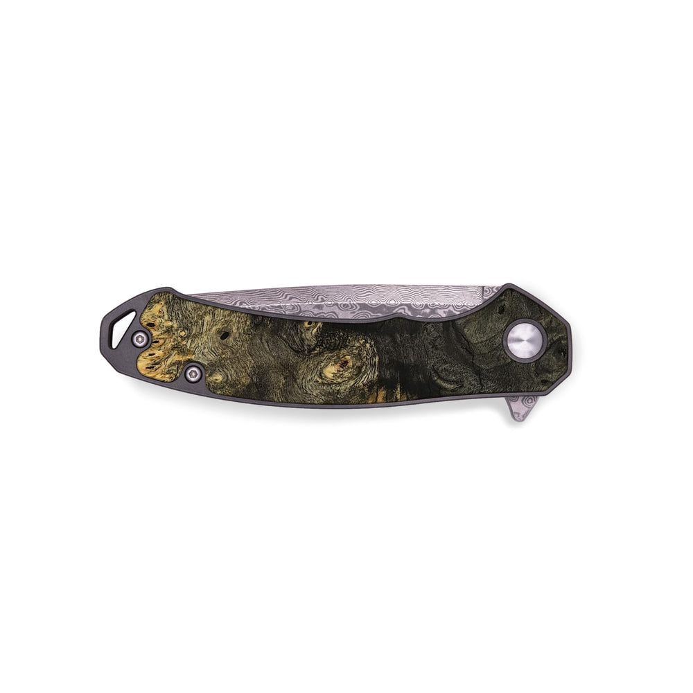 Experience the perfect blend of form and function with our durable folding pocket knife, featuring a lightweight titanium handle. The Damascus stainless steel blade is complemented by a unique wood burl and resin inlay. Imported blade and handle.
