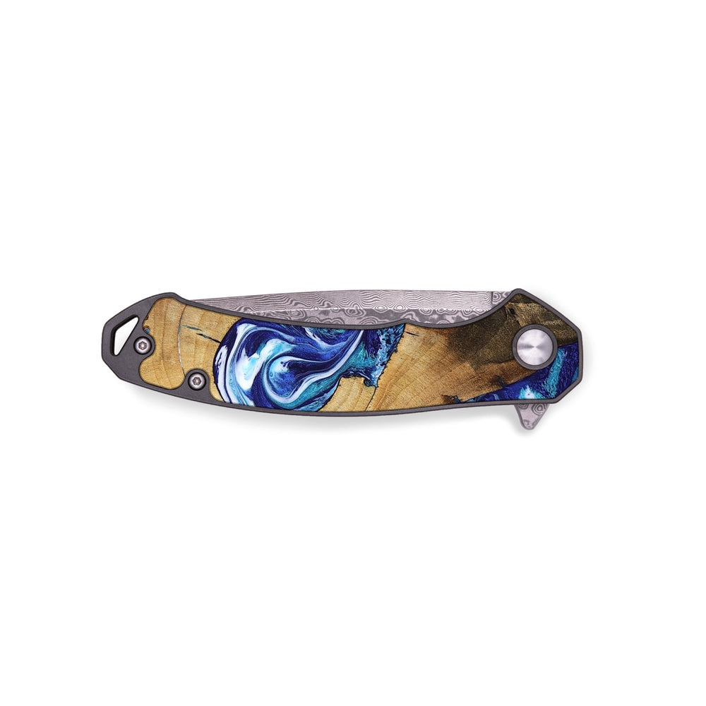 Experience the perfect blend of form and function with our durable folding pocket knife, featuring a lightweight titanium handle. The Damascus stainless steel blade is complemented by a unique wood burl and resin inlay. Imported blade and handle.