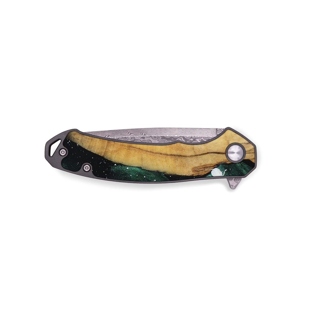 Experience the perfect blend of form and function with our durable folding pocket knife, featuring a lightweight titanium handle. The Damascus stainless steel blade is complemented by a unique wood burl and resin inlay. Imported blade and handle.