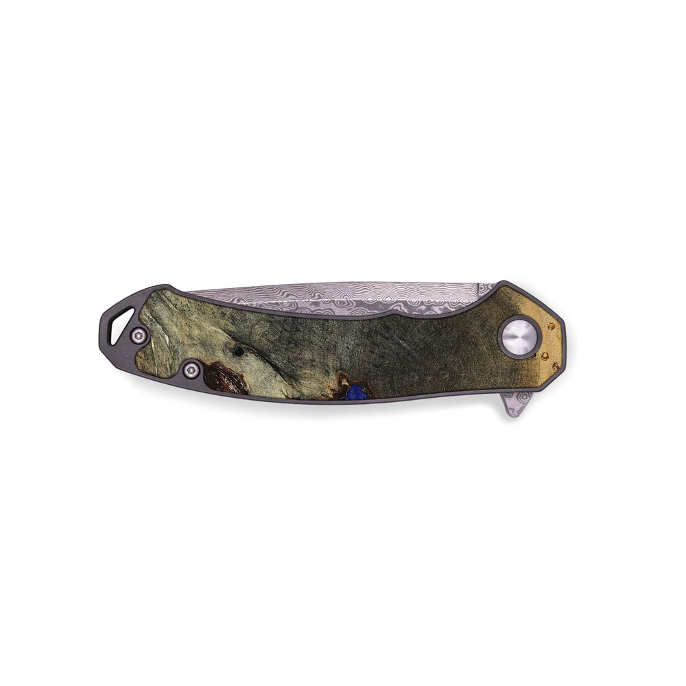 Experience the perfect blend of form and function with our durable folding pocket knife, featuring a lightweight titanium handle. The Damascus stainless steel blade is complemented by a unique wood burl and resin inlay. Imported blade and handle.