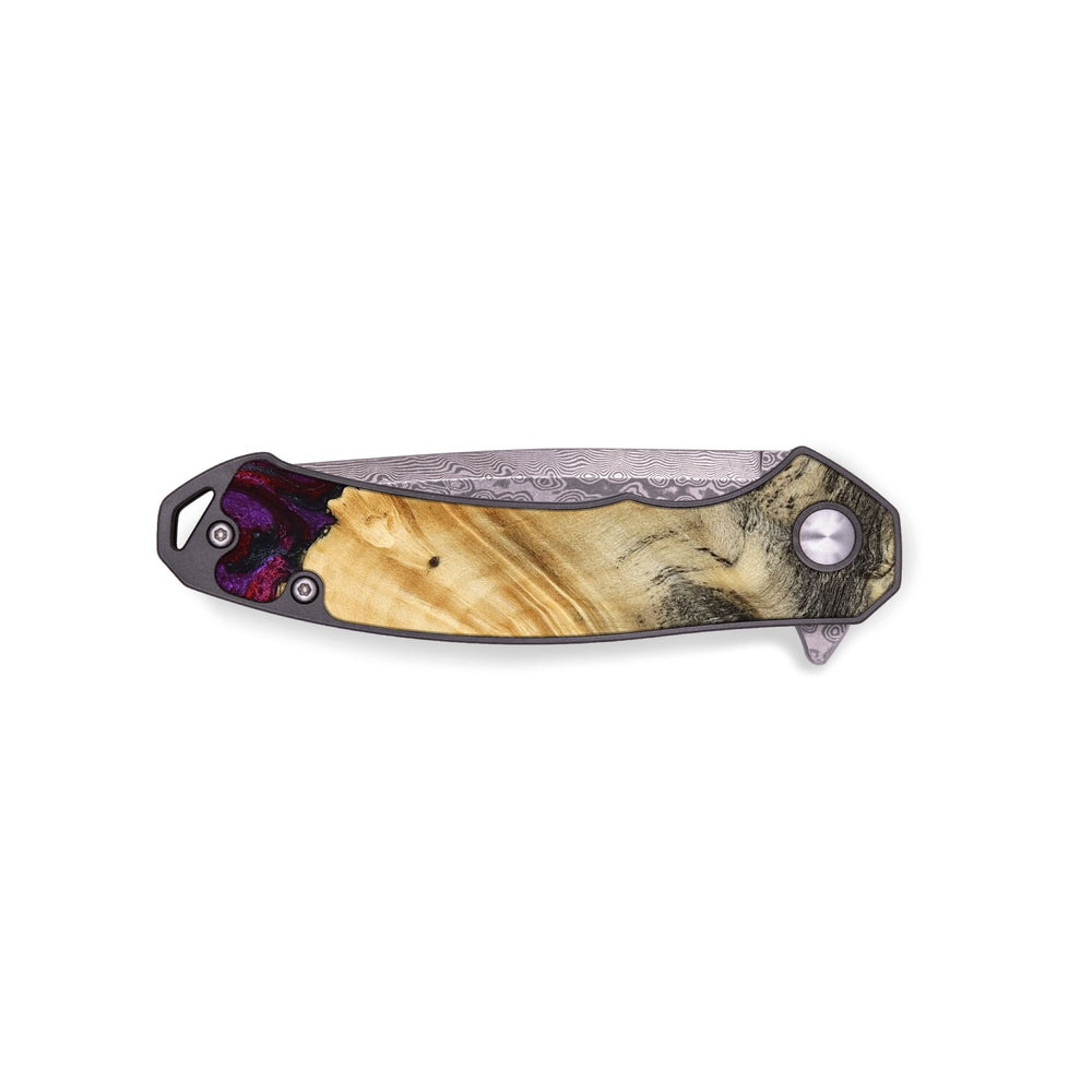 Experience the perfect blend of form and function with our durable folding pocket knife, featuring a lightweight titanium handle. The Damascus stainless steel blade is complemented by a unique wood burl and resin inlay. Imported blade and handle.