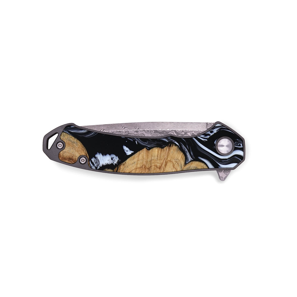Experience the perfect blend of form and function with our durable folding pocket knife, featuring a lightweight titanium handle. The Damascus stainless steel blade is complemented by a unique wood burl and resin inlay. Imported blade and handle.