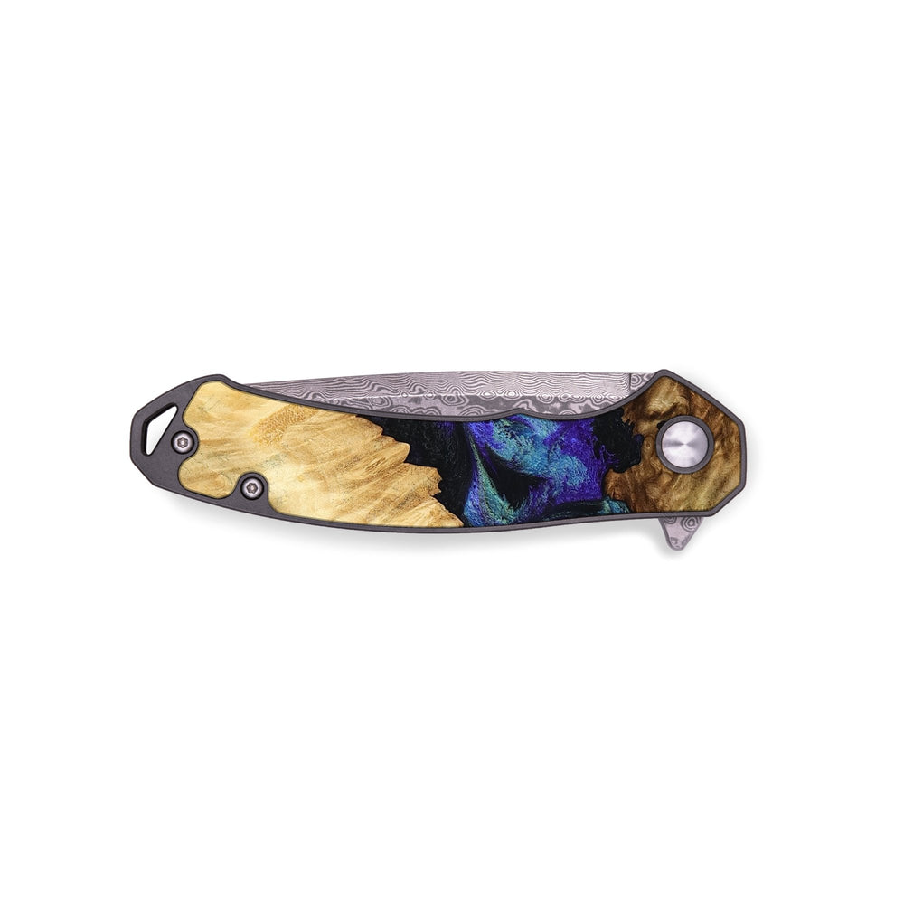 Experience the perfect blend of form and function with our durable folding pocket knife, featuring a lightweight titanium handle. The Damascus stainless steel blade is complemented by a unique wood burl and resin inlay. Imported blade and handle.