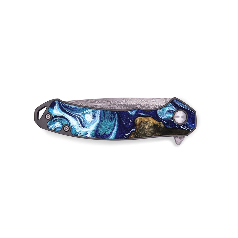 Experience the perfect blend of form and function with our durable folding pocket knife, featuring a lightweight titanium handle. The Damascus stainless steel blade is complemented by a unique wood burl and resin inlay. Imported blade and handle.