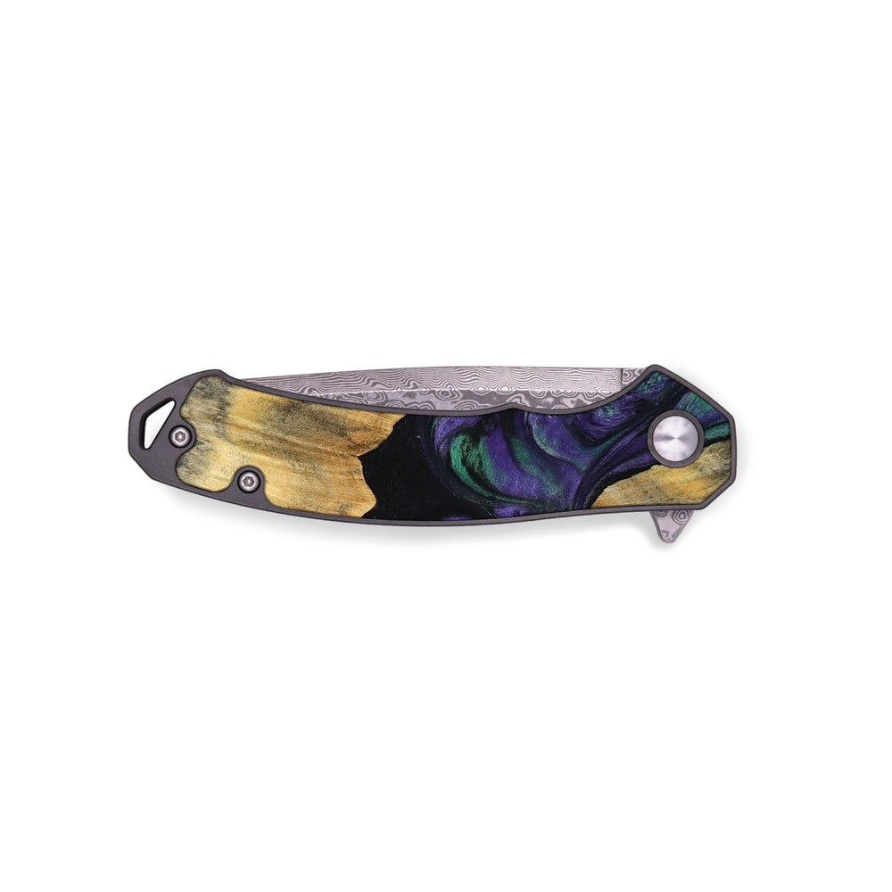 Experience the perfect blend of form and function with our durable folding pocket knife, featuring a lightweight titanium handle. The Damascus stainless steel blade is complemented by a unique wood burl and resin inlay. Imported blade and handle.
