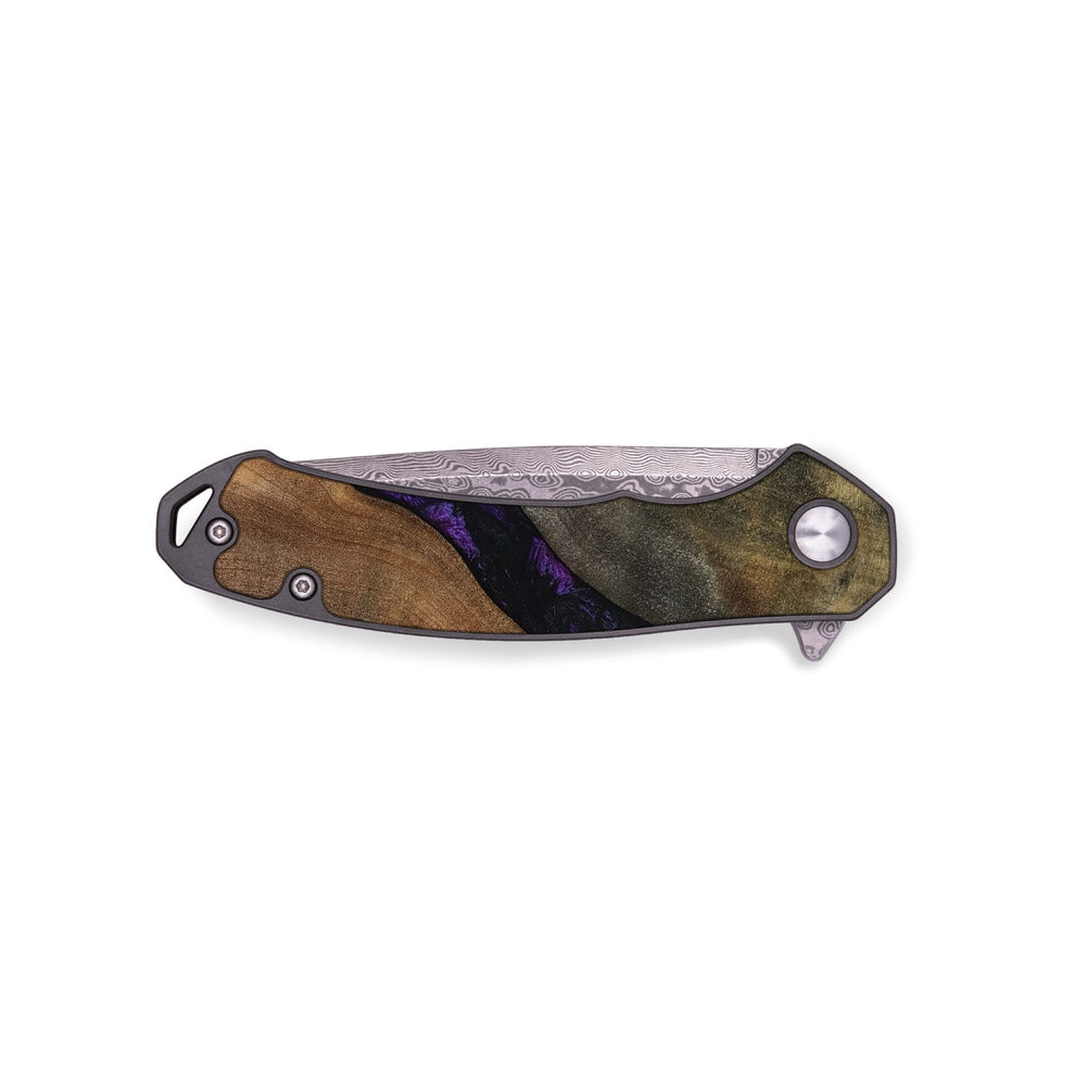 Experience the perfect blend of form and function with our durable folding pocket knife, featuring a lightweight titanium handle. The Damascus stainless steel blade is complemented by a unique wood burl and resin inlay. Imported blade and handle.
