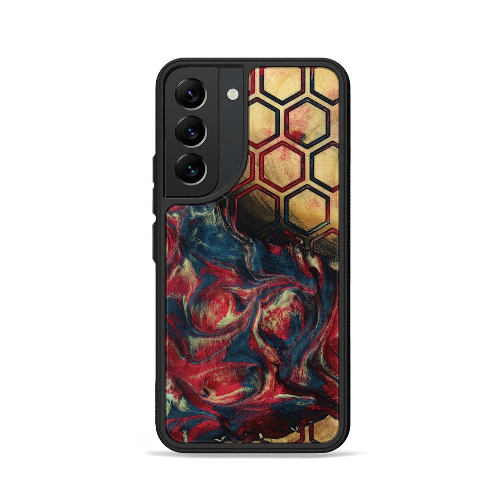 Chante has a beautiful mix of deep reds, blues, and golds swirling together. It features a striking honeycomb pattern that adds a unique touch to the natural wood.