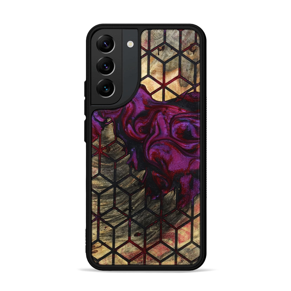 Alysha has a smooth blend of deep purple and vibrant red swirls over a natural wood grain. The piece features a nice honeycomb pattern that adds a unique touch to its overall look.