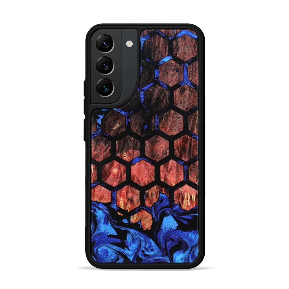 Edd is a vibrant piece of dyed wood featuring a striking honeycomb pattern. It has a blend of deep blues and warm browns that create a beautiful contrast.