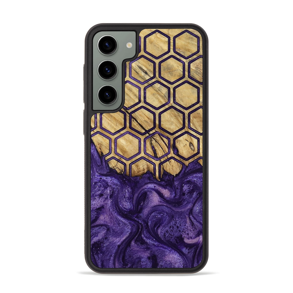 Regan has a unique pattern with honeycomb shapes arranged over a warm, golden wood background. The deep purple swirls at the bottom add a striking contrast, creating a balanced yet intriguing look.