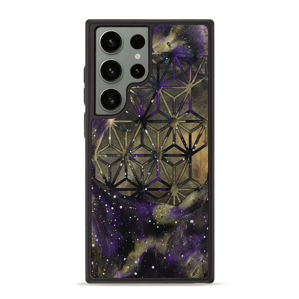 Cherish has a lovely blend of deep purples, golds, and blacks that create a cosmic feel. The repeating geometric patterns add a sense of harmony and balance to the wood.