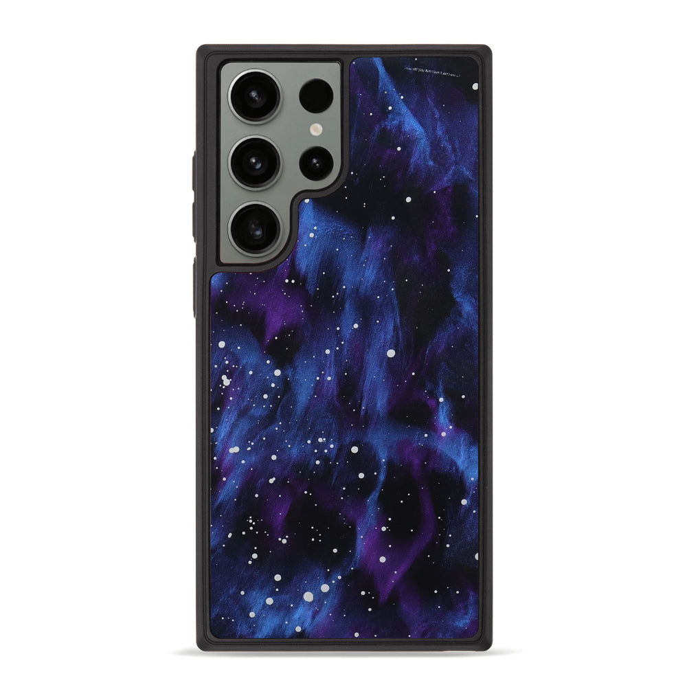 Kayson has deep shades of blue and purple that blend together, creating a cosmic feel. It features bright white specks resembling stars scattered across a dark background.