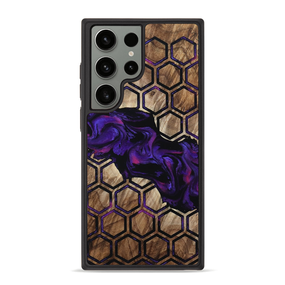 Ashtyn has a beautiful mix of warm maple wood tones and vivid purple swirls. Its hexagonal pattern adds a modern touch to the natural wood background.