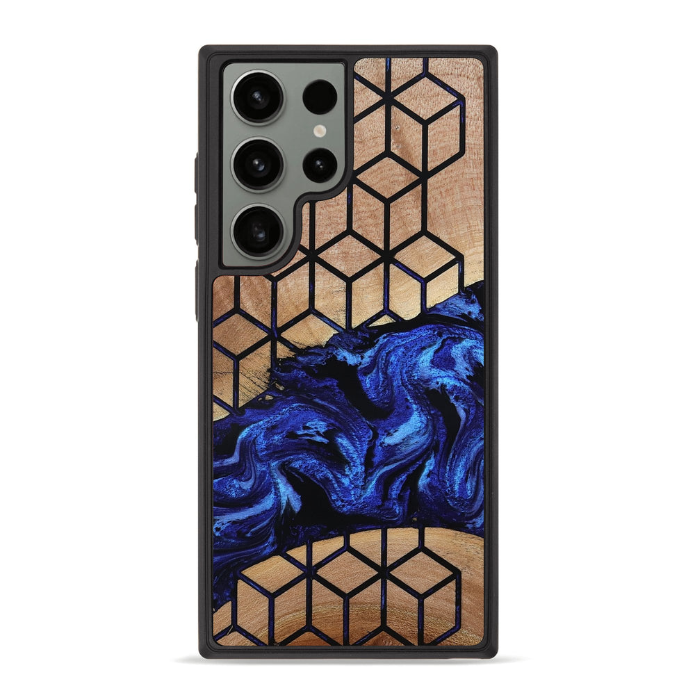 Tucker has a warm, natural look with smooth maple wood that showcases its rich grain. It features a geometric pattern of black cubes layered over swirls of deep blue, creating a striking contrast.