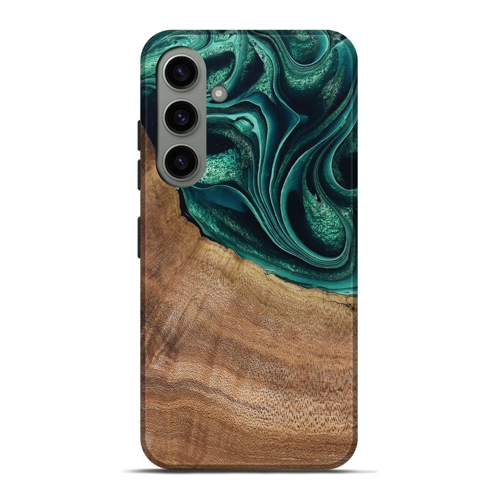 Our Live Edge cases are made from an amazing combination of stabilized wood burl and colored resin. Our stabilization process hardens the wood to protect against cracks and breaks. We do every step of the process at our shop in Northern Indiana. Perfectly fits the Galaxy S24 Plus.